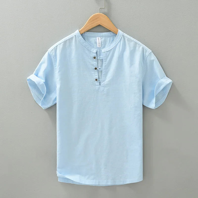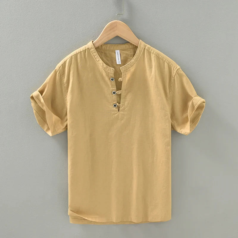 Inspired by the ease of Mediterranean days, this shirt is crafted from a breathable cotton-linen blend for a naturally relaxed drape. The band collar and open placket offer a refined, minimalist silhouette—perfect for warm weather, slow mornings, and understated style with depth.