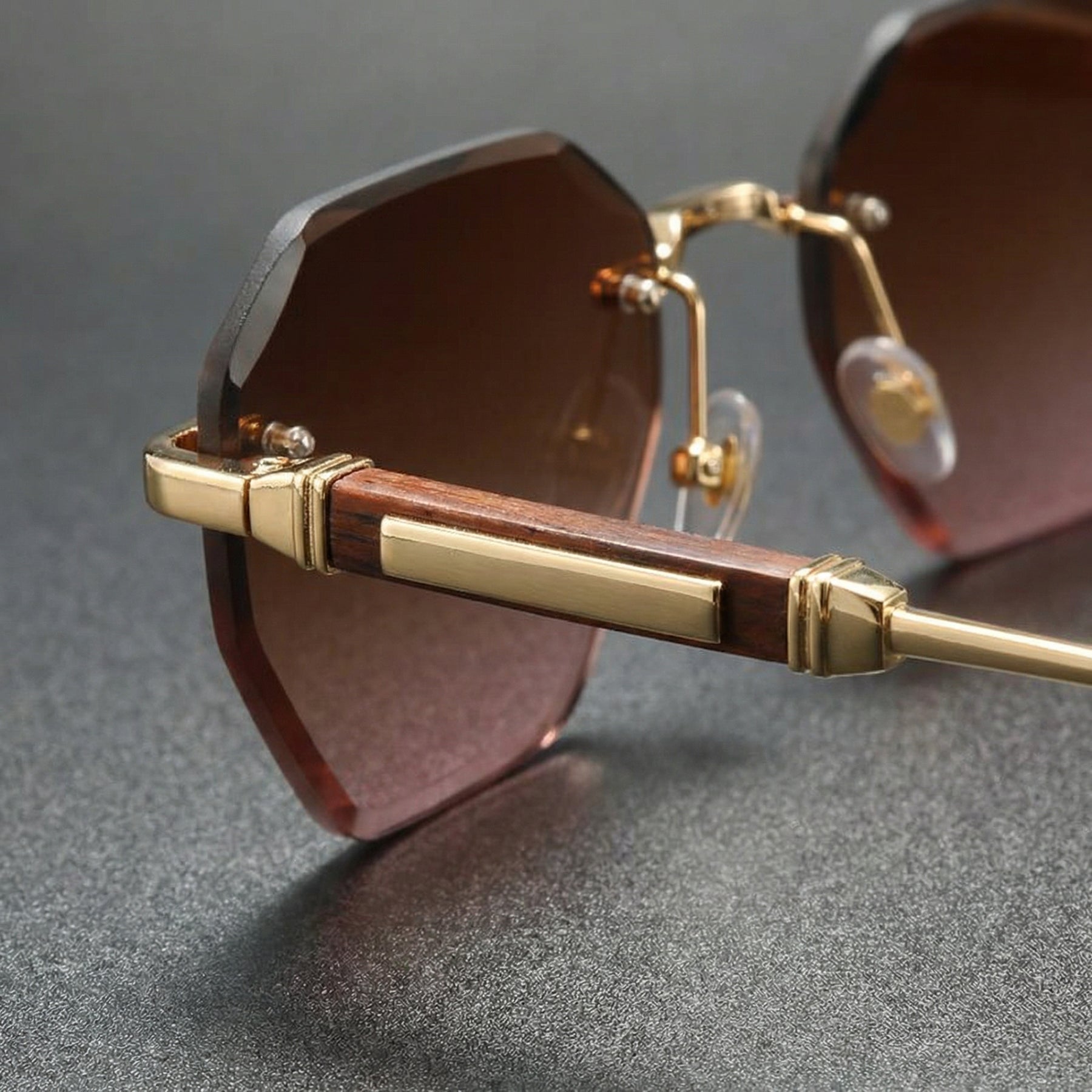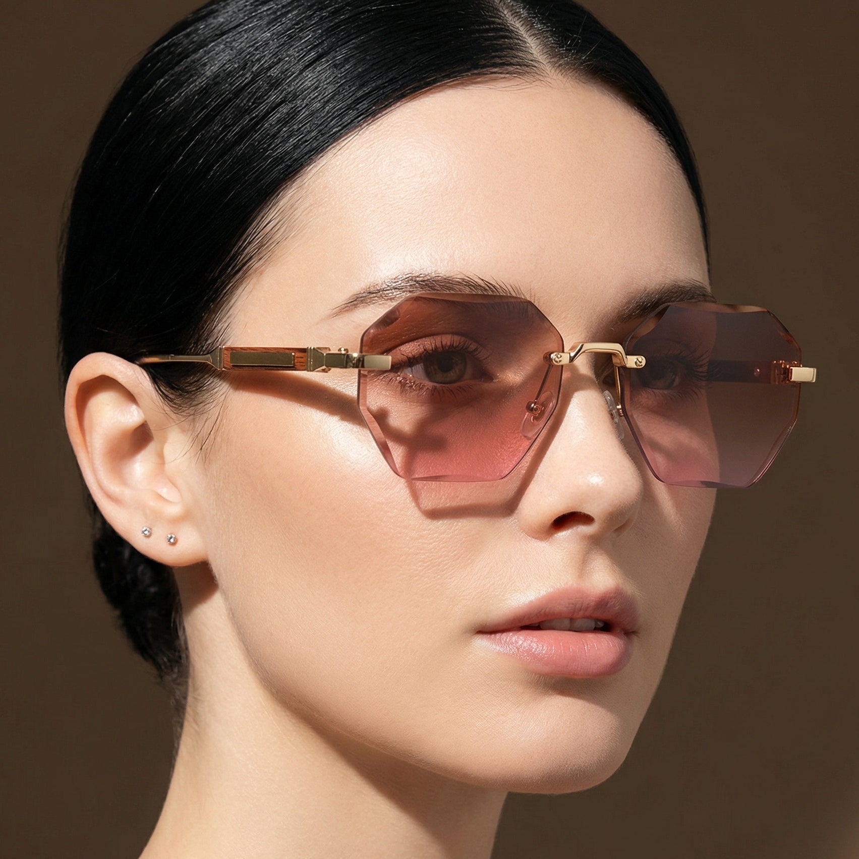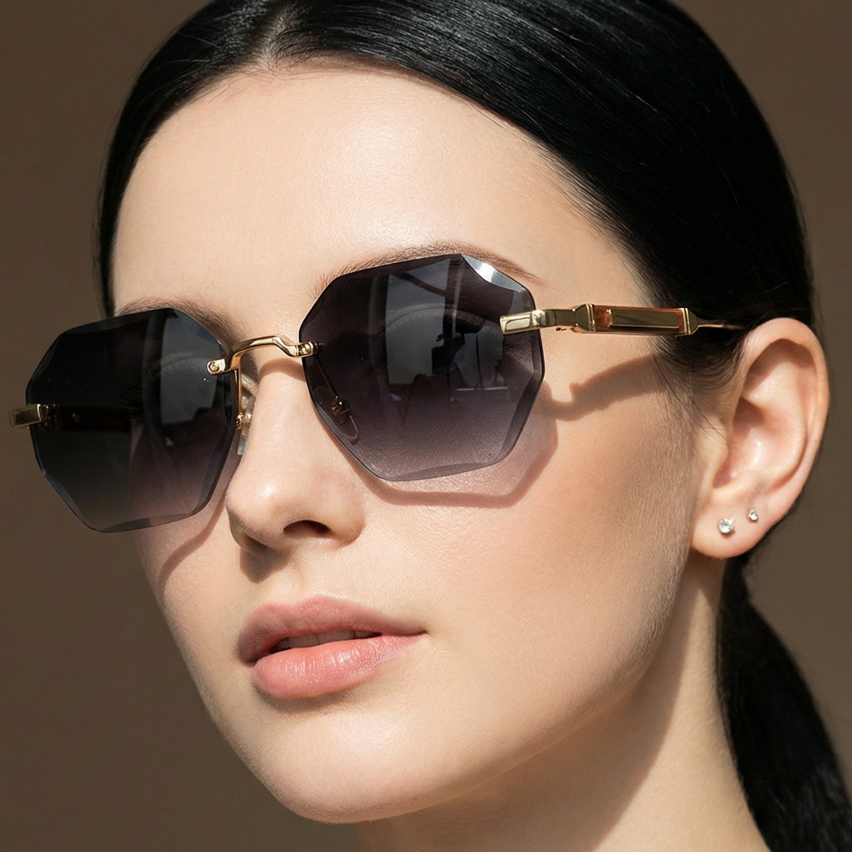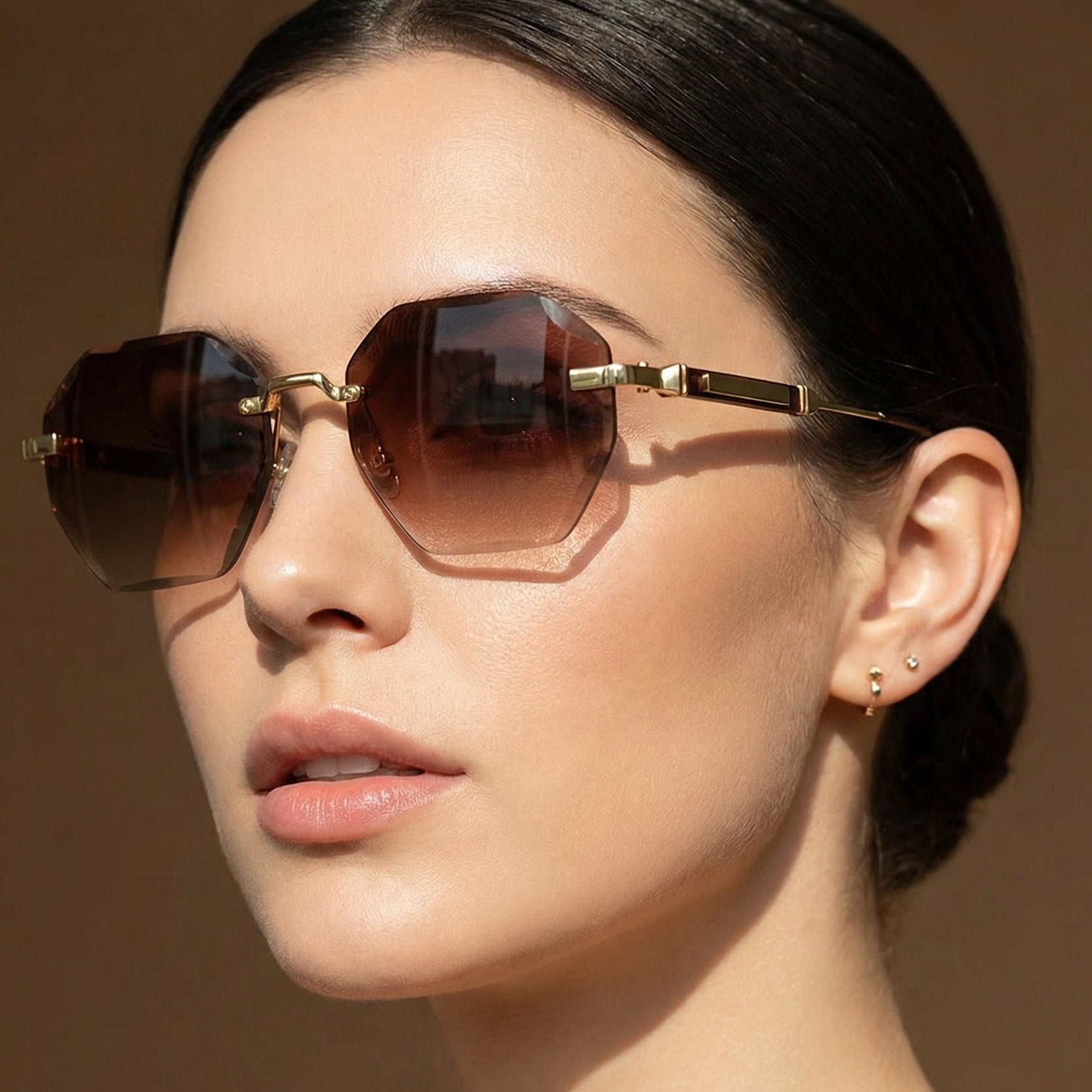 Rimless polygon frames with UV400 protection deliver lightweight, modern sophistication. Clean metal detailing and sharp geometry make them a refined statement for everyday city wear.